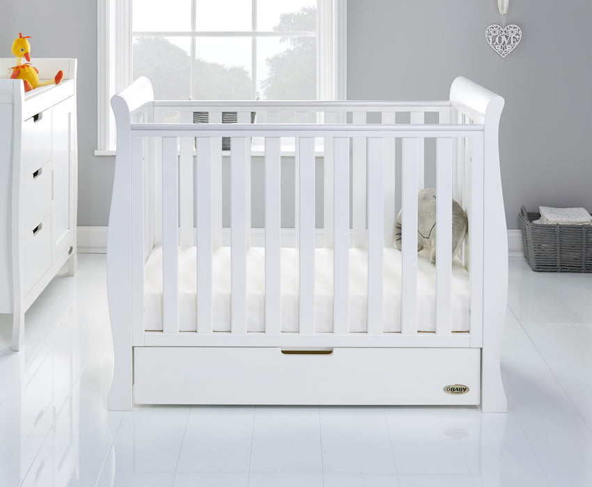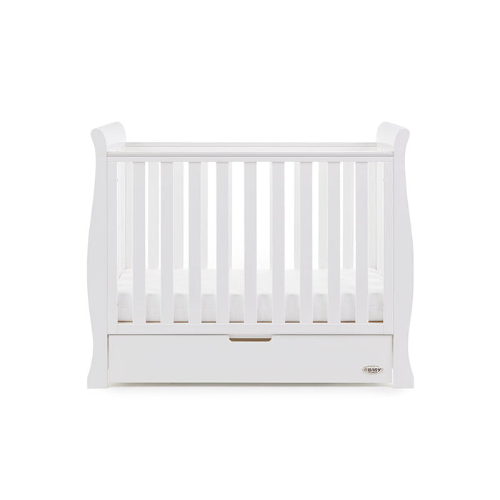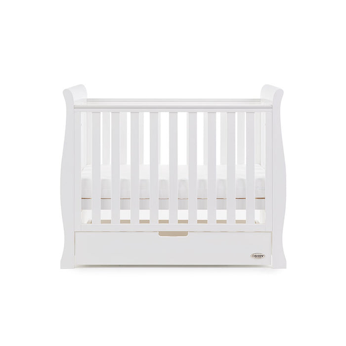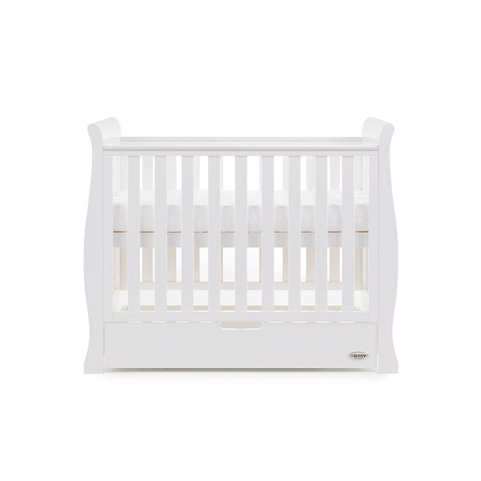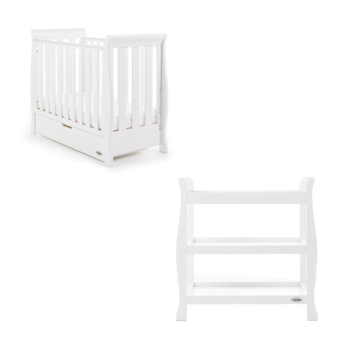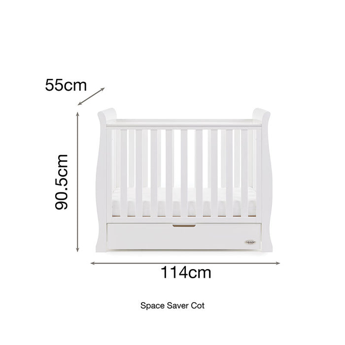 The Obaby Stamford furniture range offers families the perfect combination of style, quality and practicality. The Stamford Space Saver 2 piece room set consists of the beautiful and compact Stamford Space Saver cot with under drawer and the practical open changing unit. Both pieces feature the same elegant sleigh design that flows through the rest of the Stamford range